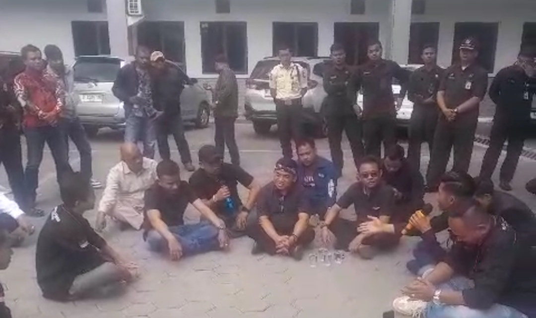 Pada pukul 12.15, Sekretaris Dinas DBMPR bersama pejabat terkait akhirnya menemui massa sambil duduk lesehan di halaman kantor.